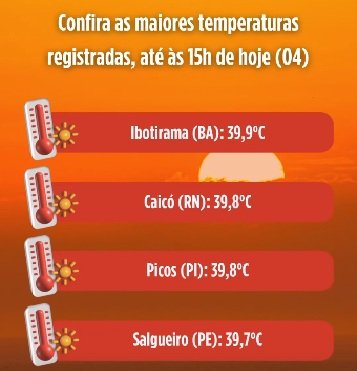 Essa é a segunda vez em menos de um mês que Salgueiro aparece no Top 4 das cidades mais quentes do Brasil, segundo o Inmet. Em 20 de outubro, o município ficou em 3° lugar com o termômetro marcando 39,1°C, superando Picos-PI (38,6°C) e abaixo de Cabrobó-PE (39,2°C) e Caicó-RN (39,2°C).