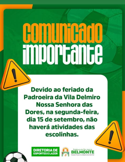 A Prefeitura de São José do Belmonte informa à população que, em virtude do feriado em homenagem à Padroeira da Vila Delmiro, Nossa Senhora das Dores, não haverá atividades nas escolinhas esportivas na próxima segunda-feira, 15 de setembro.