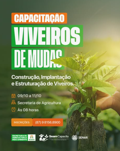 Durante os dias 09 e 10 de outubro, a partir das 8h, na sede da Secretaria de Agricultura, os participantes terão a oportunidade de aprender sobre construção, implantação e estruturação de viveiros, ampliando seus conhecimentos e práticas sustentáveis no campo.