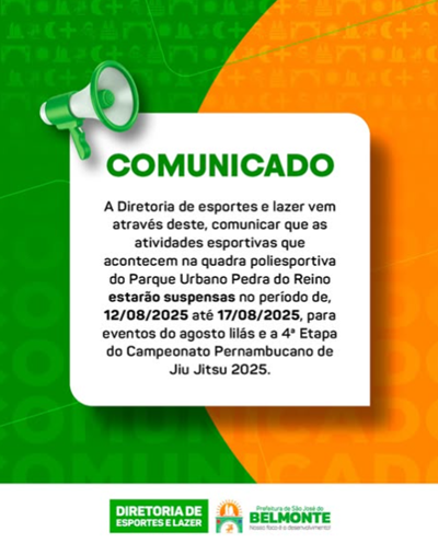 A Diretoria de Esportes e Lazer de São José do Belmonte informa que as atividades esportivas na quadra poliesportiva do Parque Urbano Pedra do Reino estarão suspensas entre os dias 12 e 17 de agosto. A pausa temporária se deve à realização de dois importantes eventos no local: as ações do Agosto Lilás, campanha de combate à violência contra a mulher, e a 4ª etapa do Campeonato Pernambucano de Jiu-Jitsu 2025.