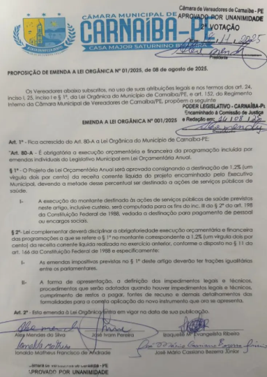 Vereadores de Carnaíba aprovaram emenda à Lei Orgânica 001/2025 criando na execução orçamentária e financeira do município emendas individuais do Legislativo Municipal em Lei Orçamentária Anual.