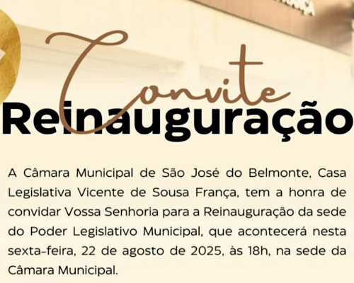 A Câmara Municipal de São José do Belmonte, conhecida como Casa Legislativa Vicente de Sousa França, será reinaugurada nesta sexta-feira, 22 de agosto, às 18h, em sua sede oficial. O evento marca um momento simbólico para o Legislativo municipal, que volta a contar com um espaço revitalizado para receber a população e conduzir os trabalhos parlamentares.