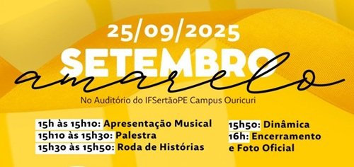 No próximo dia 25, o Campus Ouricuri do IFSertãoPE promove um evento sobre a campanha “Setembro Amarelo”, com objetivo de refletir sobre a valorização e o sentido da vida. A ação será realizada no auditório da instituição, com apresentação musical, palestra e Roda de Histórias.