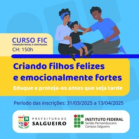 Nessa terça-feira, 1, o Campus Salgueiro do IFSertãoPE divulgou o Edital n° 08/2025, referente à abertura de inscrições para o curso de Formação Continuada (FIC) “Criando filhos felizes e emocionalmente fortes: eduque e proteja antes que seja tarde”.
