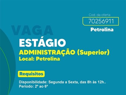 O Centro de Integração Empresa-Escola de Pernambuco (CIEE-PE) divulgou nesta segunda-feira, 8, uma vaga de estágio em Administração disponível em Petrolina.