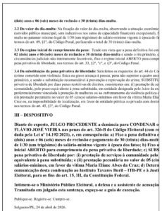 A sentença foi proferida pelo juiz eleitoral José Gonçalves de Alencar, da 75ª Zona Eleitoral de Salgueiro, que fixou pena de 2 anos e 6 meses de reclusão, além de 30 dias-multa. A pena privativa de liberdade, no entanto, foi substituída por prestação de serviços à comunidade e pagamento de cinco salários-mínimos à vítima.
