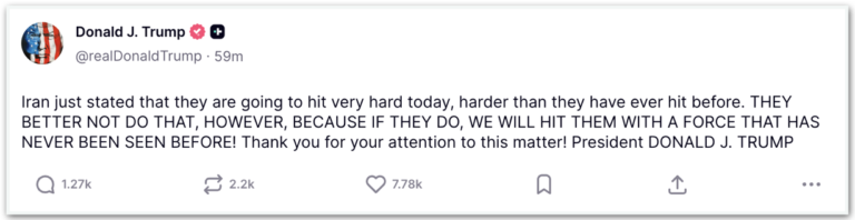 O presidente dos Estados Unidos, Donald Trump, fez uma declaração forte em resposta à ameaça da IRGC (Guarda Revolucionária Islâmica) de realizar uma ofensiva contra Israel e instalações militares norte-americanas. Em sua rede social Truth Social, Trump afirmou que os EUA atacarão o Irã "com uma força nunca vista antes" caso a ameaça se concretize.