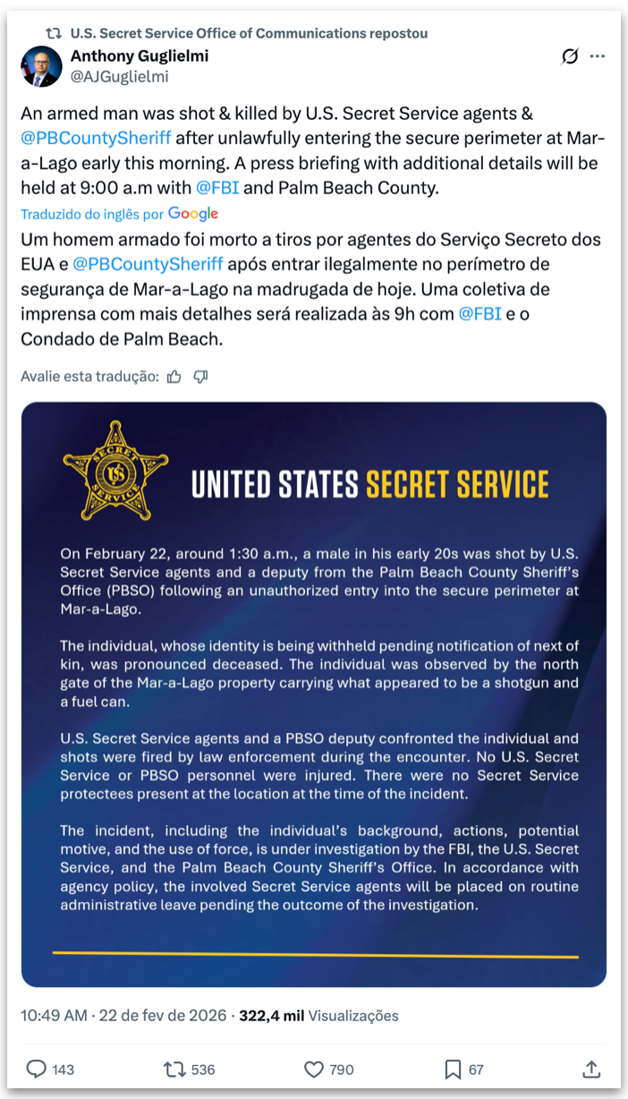 Na madrugada de domingo, um jovem de 20 anos foi morto a tiros ao invadir o perímetro de segurança do resort Mar-a-Lago, localizado em Palm Beach, Flórida. O presidente Donald Trump estava na Casa Branca, em Washington, durante o incidente.