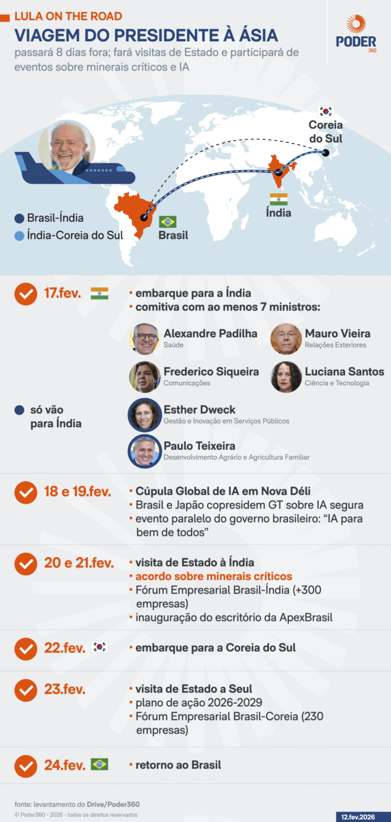 A comitiva brasileira também participará do Fórum Empresarial Brasil-Índia, que abordará temas como indústria e minerais estratégicos, mobilidade e transição energética, saúde e farmacêutica, segurança alimentar e inovação agrícola.