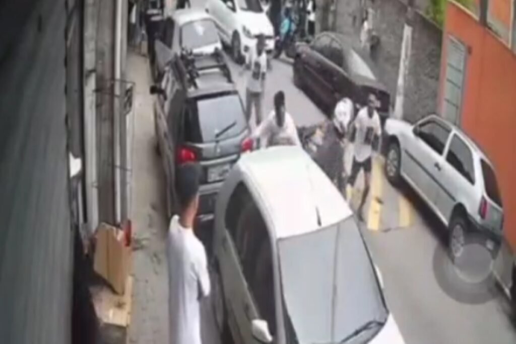 Um vídeo mostra o momento em que o suspeito, de moto, passa pela via e os populares bloqueiam a passagem do PM, que o acompanhava, também de motocicleta.