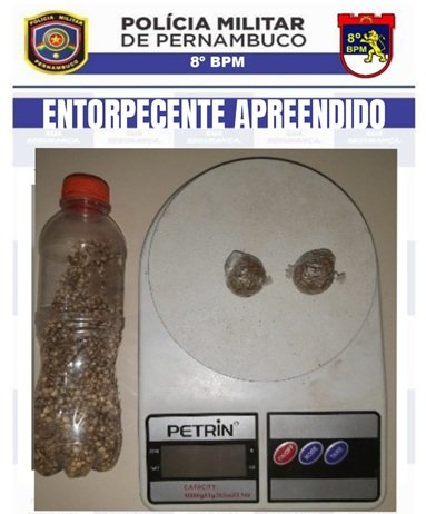 A Polícia Militar do 8° BPM deteve na tarde desta quinta-feira, 8, por volta das 16h50, um homem flagrado com duas trouxinhas de maconha, pesando aproximadamente 3,5 gramas, em Terra Nova-PE. Ele alegou ser usuário e confessou que tinha sementes do entorpecente em casa.