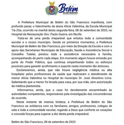 Na noite desta segunda-feira, 8, a Prefeitura de Belém do São Francisco quebrou o silêncio em relação ao caso da estudante Alícia Valentina, de 11 anos, que teve cerebral confirmada pelo Hospital da Restauração nesse fim de semana, após ser agredida por outros alunos na Escola Municipal Tia Zita na última quarta-feira, 3.