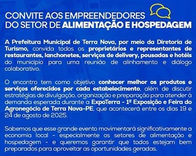 A Prefeitura Municipal de Terra Nova, por meio da Diretoria de Turismo, convida todos os proprietários e representantes de restaurantes, lanchonetes, serviços de delivery, pousadas e hotéis do município para uma reunião de alinhamento e diálogo colaborativo.