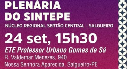 O Sindicato dos Trabalhadores em Educação de Pernambuco (Sintepe) realiza nesta quarta-feira, 24, em Salgueiro, uma plenária voltada aos professores do Núcleo Regional Sertão Central. O encontro terá participação da presidente da entidade, Ivete Caetano, e da assessoria jurídica.