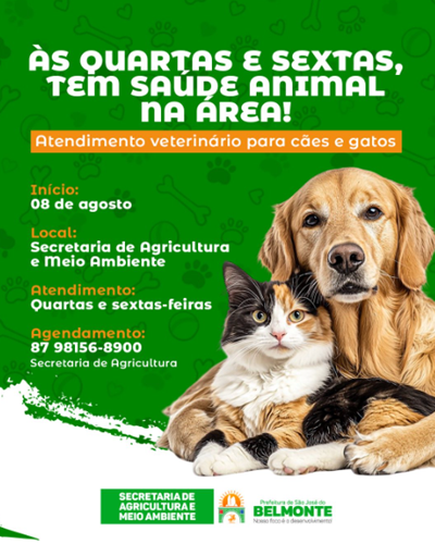 A Prefeitura de São José do Belmonte, por meio da Secretaria de Agricultura e Meio Ambiente, inicia no dia 08 de agosto um novo serviço de atendimento veterinário gratuito para cães e gatos do município.