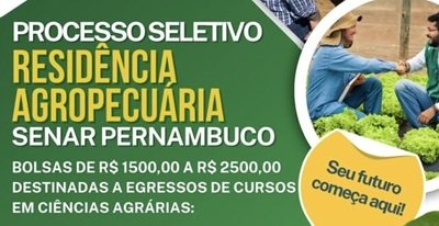 O Serviço Nacional de Aprendizagem Rural de Pernambuco (Senar-PE) encerra amanhã (26/09) as inscrições para o Programa de Residência Agropecuária, iniciativa que oferece 7 vagas para início em fevereiro de 2026. O programa garante aos participantes bolsas mensais de até R$ 2.500,00 e uma formação prática e intensiva em propriedades rurais.