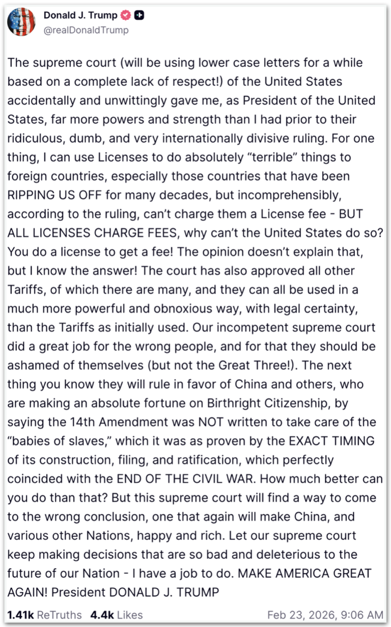 O presidente dos Estados Unidos, Donald Trump, declarou que a Suprema Corte deu a ele "muito mais poderes e força" ao barrar as tarifas do governo a países estrangeiros. Em um post na Truth Social, ele chamou a decisão de "ridícula, estúpida e muito divisiva internacionalmente".