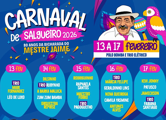 Foi divulgada neste domingo (8) pela prefeitura de Salgueiro, a programação completa do Carnaval de 2026, com tema “80 anos da Bicharada do Mestre Jaime”.